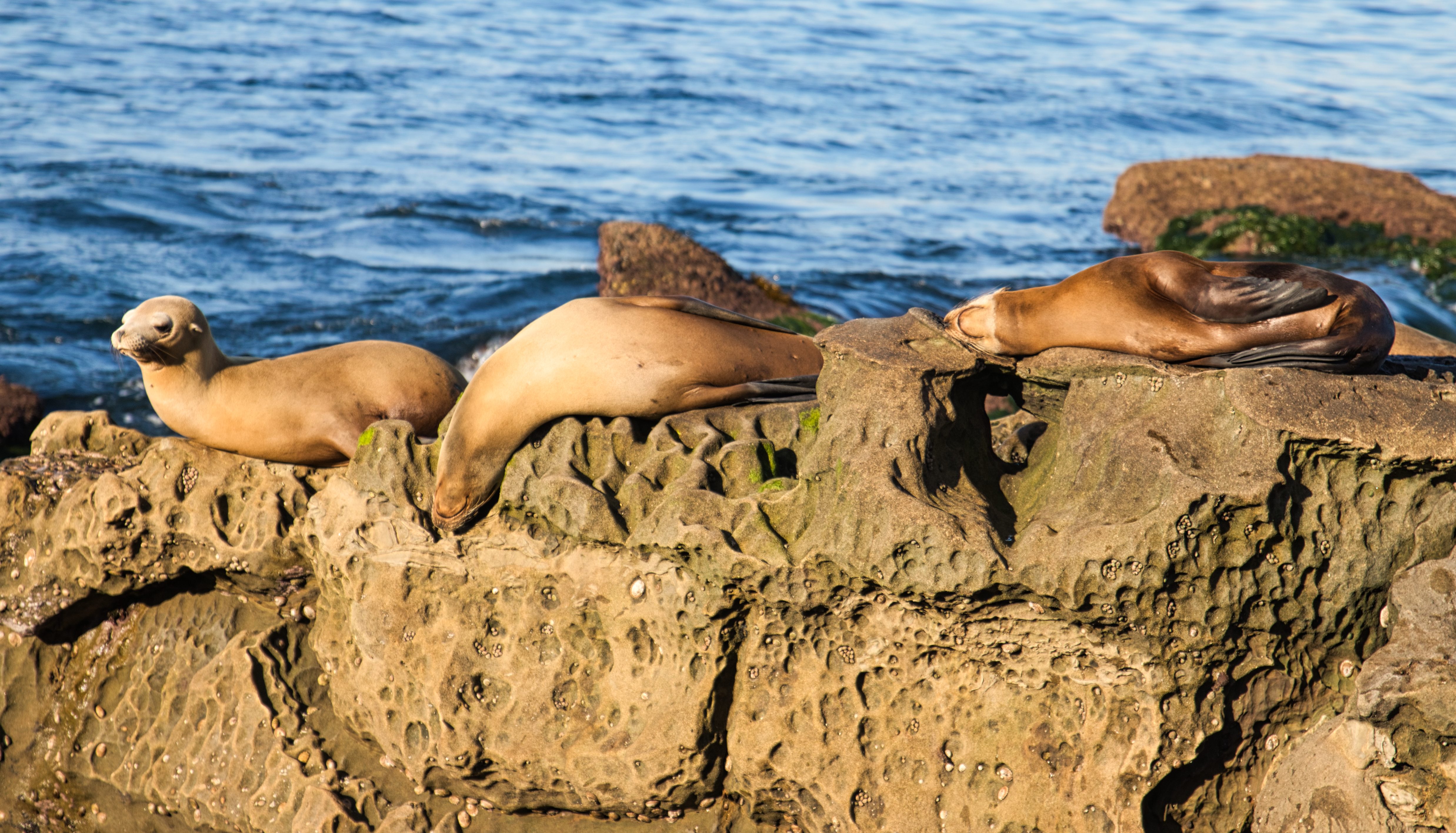 These sea lions are living the good life, basking in the sun and relaxing, or at least it would seem. This photo was taken at La Jolla Cove in San Diego, California. There are tons of sea lions and birds relaxing on the rocks, it is a pretty amazing sight to see. However, it is also a little sad, because there are far too many people who do not give the animals their space and cause way too much stress for the animals.