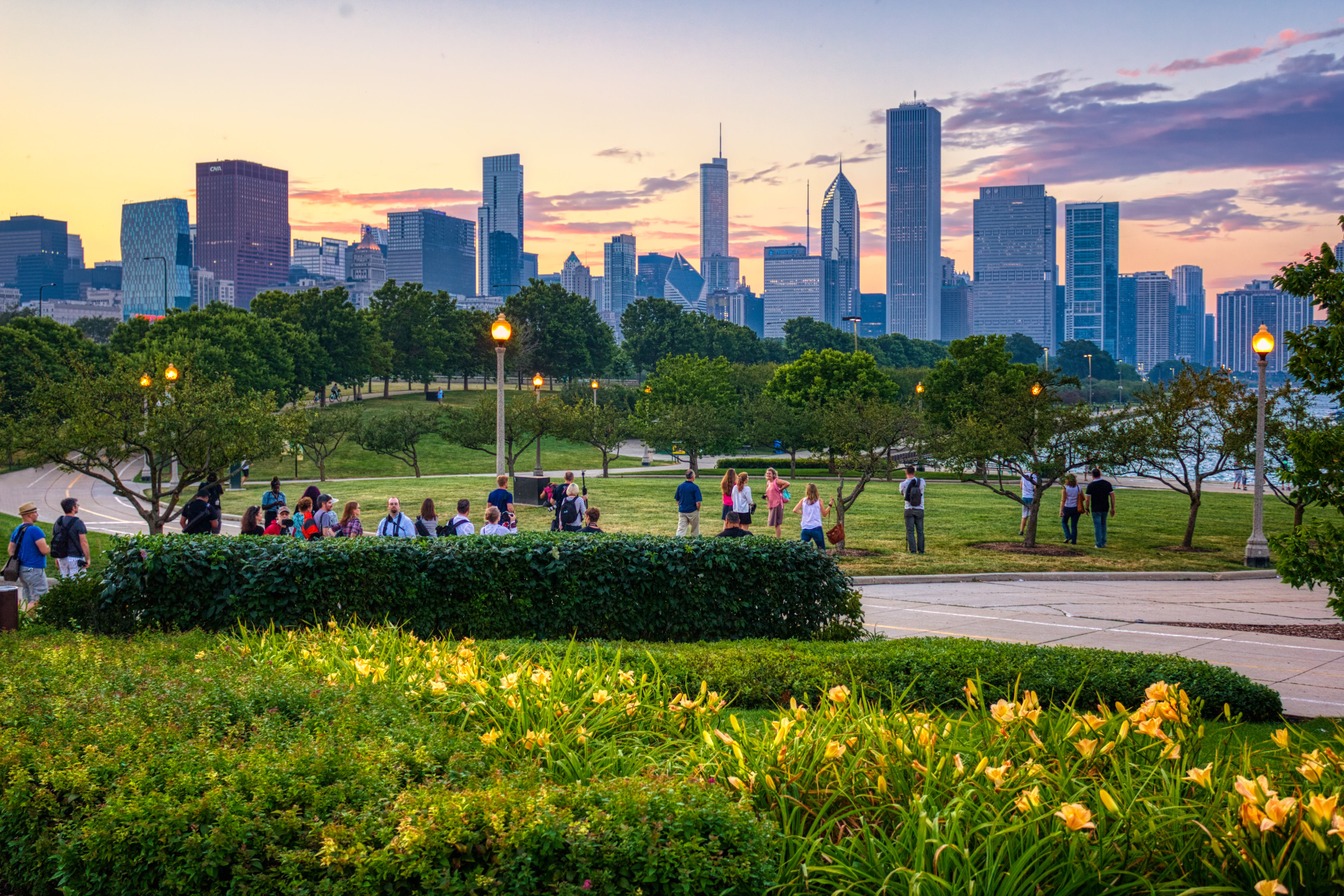 The weather here has been pretty miserable the past few days: cold, windy, rainy. Oh, and a mid-April snowstorm a few days ago. This time of year, summer can’t get here quickly enough. This photo just screams summer to me: green trees, flowers in bloom, a warm sunset, and people congregating in the park. Those days aren’t too far away, though it sure doesn’t feel like it right now.