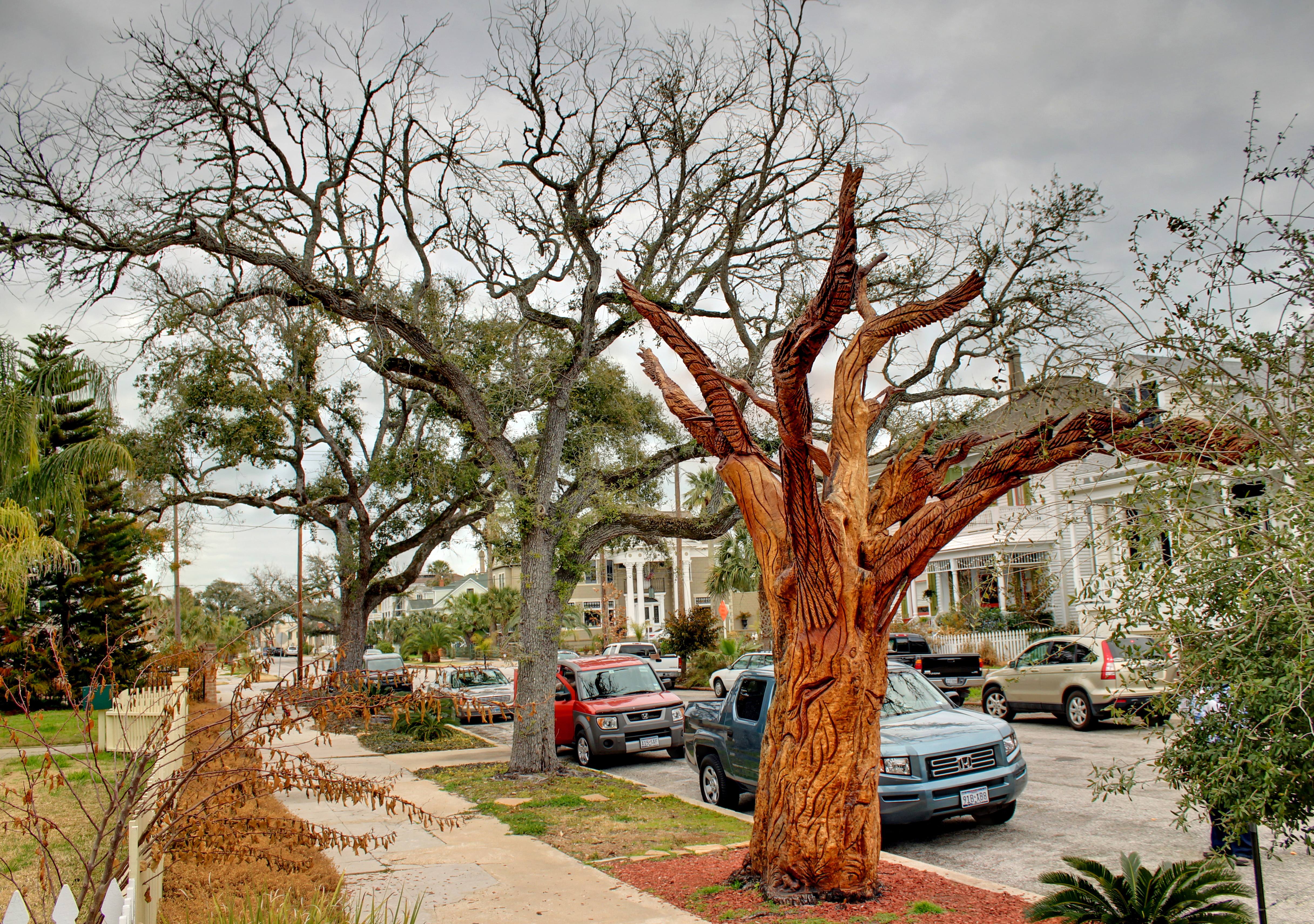 Galveston, Texas was hit pretty badly by Hurricane Ike in 2008 and many trees were destroyed. A local group had the great idea of turning the destroyed remains of some of the trees into works of art and today you can take a free self-guided tour of the more than 20 carvings scattered throughout Galveston. The sculpture in this photo is titled “Birds of Galveston.” My dad was the one who had the idea of taking the photo so that the neighboring trees that were spared by the hurricane are in the background.