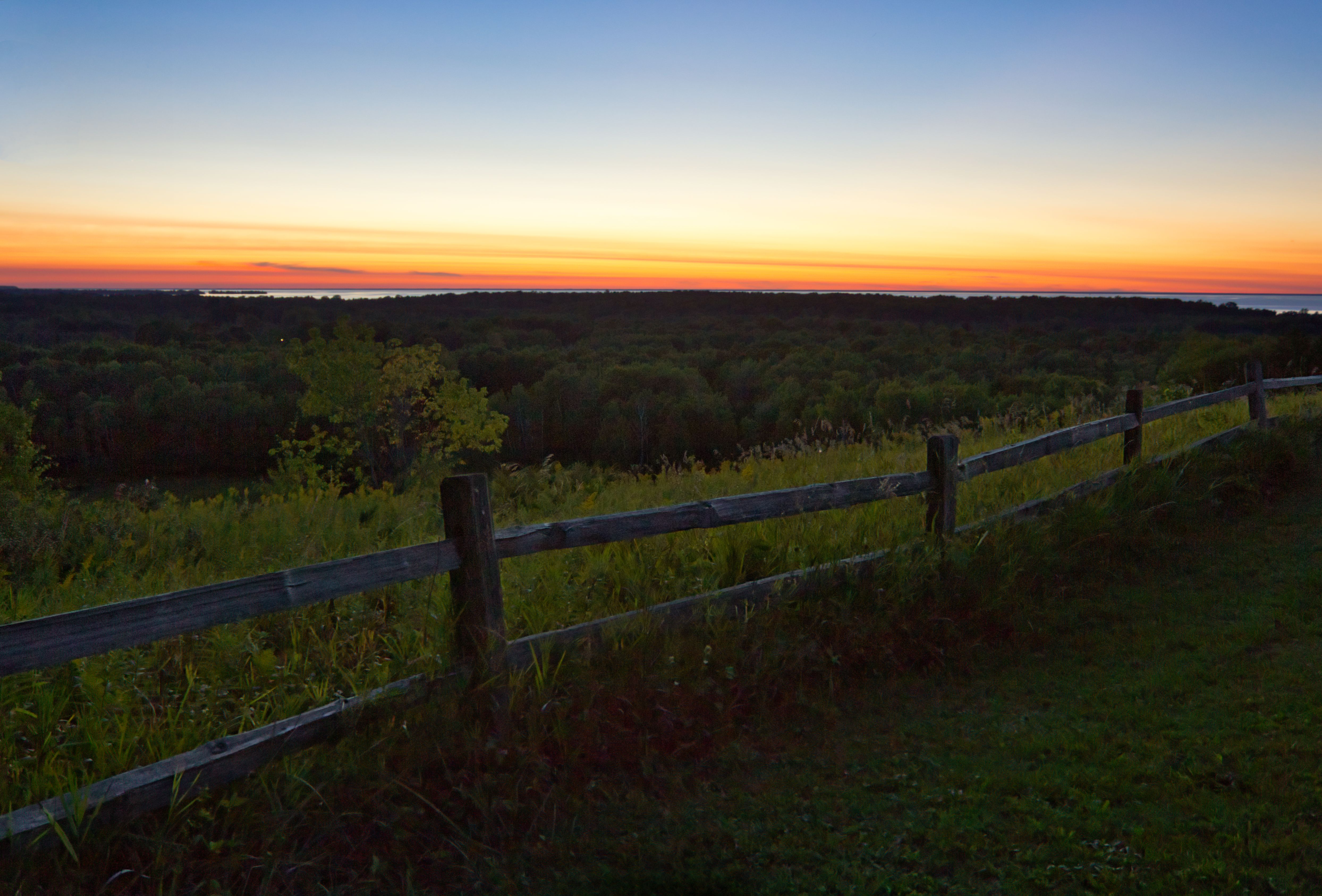 This photo was taken at Potawatomi State Park, located just outside Sturgeon Bay, Wisconsin. After a day of exploring further north in Door County, we finished our day with a hike along one of the trails of Potawatomi State Park. We started our hike from where this photo was taken a little over an hour before sunset, thinking we would be back before the sun disappeared below the horizon. However, we underestimated the distance of the hike and it was getting pretty dark in the woods near the end of our hike. Our hike turned into a run for the last few minutes and we made it back to where we started just in time to catch the end of a beautiful sunset.