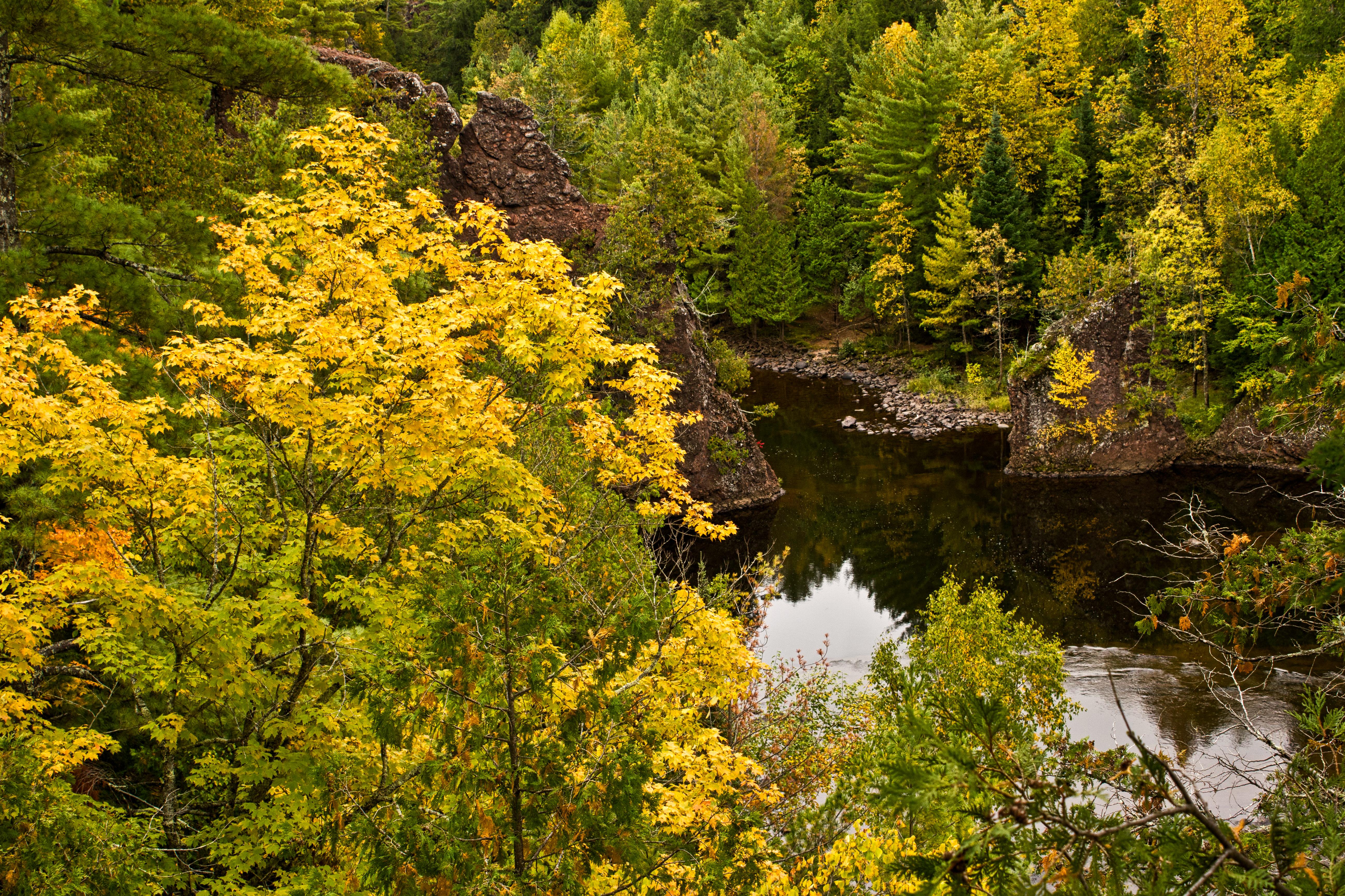 The waterfalls in Wisconsin may not be as impressive as those in Iceland or Hawaii but there are some that are worth seeing. Copper Falls State Park is a beautiful state park in northern Wisconsin at the intersection of two rivers. The park has a couple waterfalls (spoiler alert: one of them is named Copper Falls), trails with great views of the rivers and surrounding forest, and interesting geology. We visited on a fall day several years ago to see the waterfalls and enjoy the fall colors. The hiking was great due to the beautiful fall weather but the fall colors were just a little before their peak. While many of the trees in the park had leaves that had turned yellow, those that turn red and orange had not really started changing their color yet. Fortunately, the few trees that had started turning already just happened to be right next to Copper Falls.